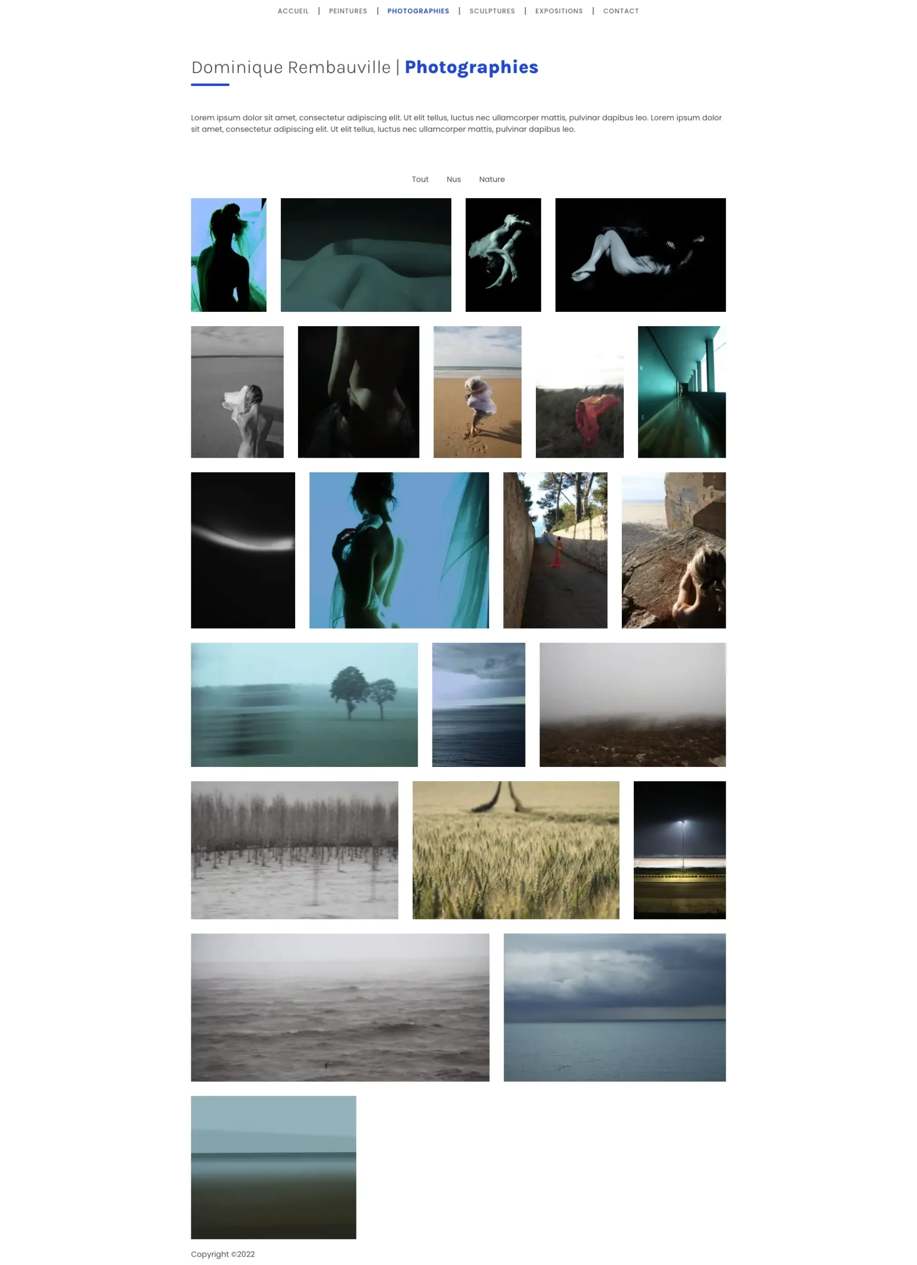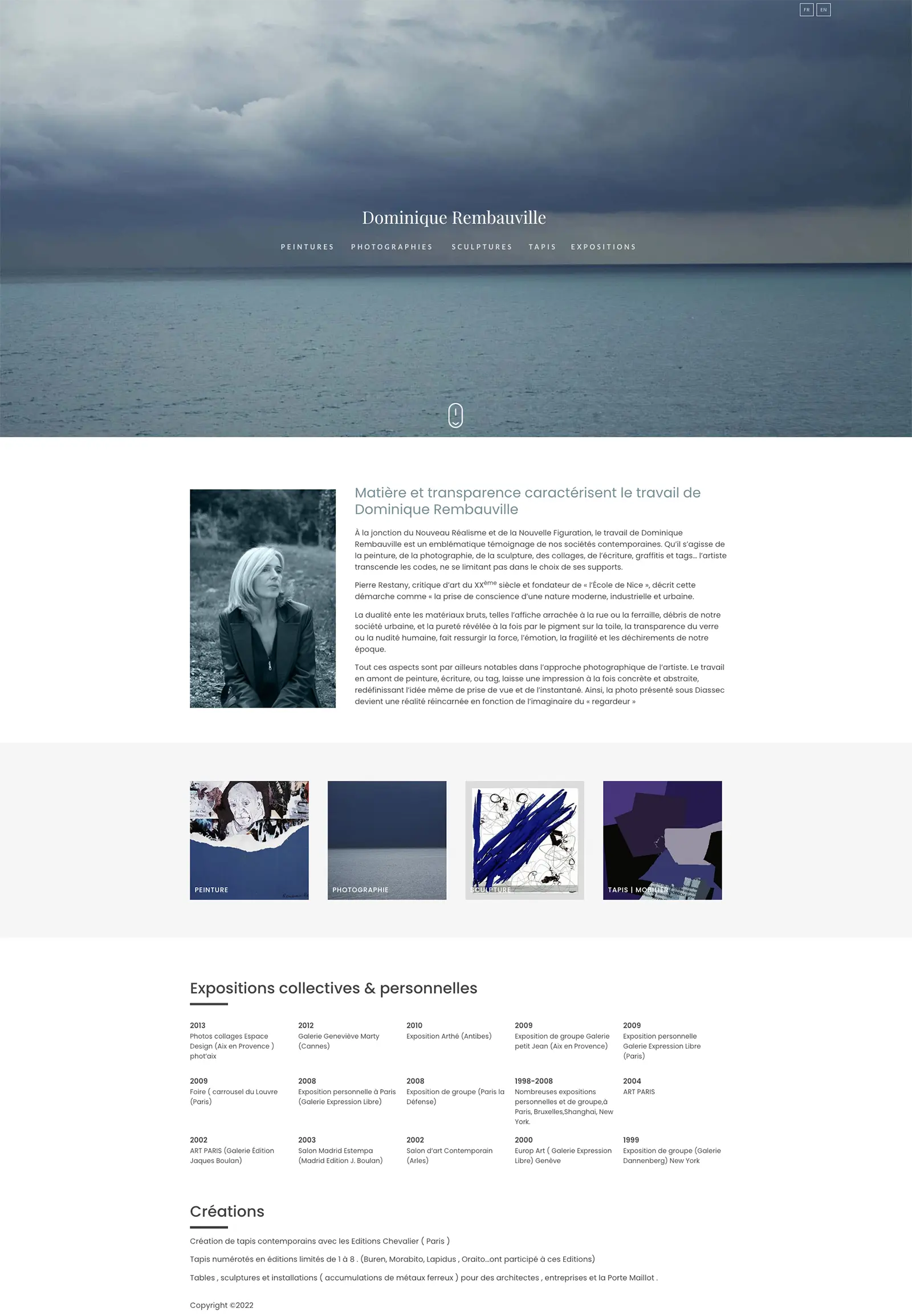 Dominique Rembauville, plasticienne et photographe d’art née en 1950, explore depuis de nombreuses années des langages visuels où se mêlent matière, transparence, déchet et couleur. Formée à Paris (ateliers Claude Schurr, Port-Royal, La Grande Chaumière), elle a sa première exposition personnelle dès 1987. Elle a depuis exposé à Paris, New York, Bruxelles, Washington, Europ’Art Genève (2001), Arténîmes (2002), Madrid Estampa (2003), et de manière permanente à la Galerie Arthè d’Antibes.