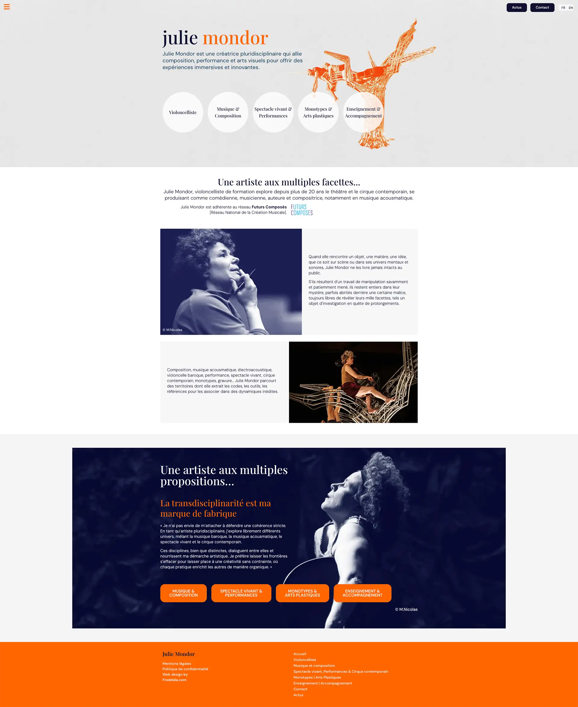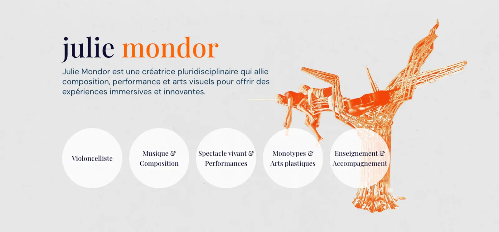 Julie Mondor est une créatrice pluridisciplinaire qui conjugue musique, performance et arts visuels pour proposer des expériences immersives et innovantes. Violoncelliste de formation, elle puise dans plus de vingt années d’exploration du théâtre, du cirque contemporain, de la musique acousmatique, de l’électroacoustique, et des arts plastiques (monotypes, gravure), pour tisser des univers artistiques riches et hybrides